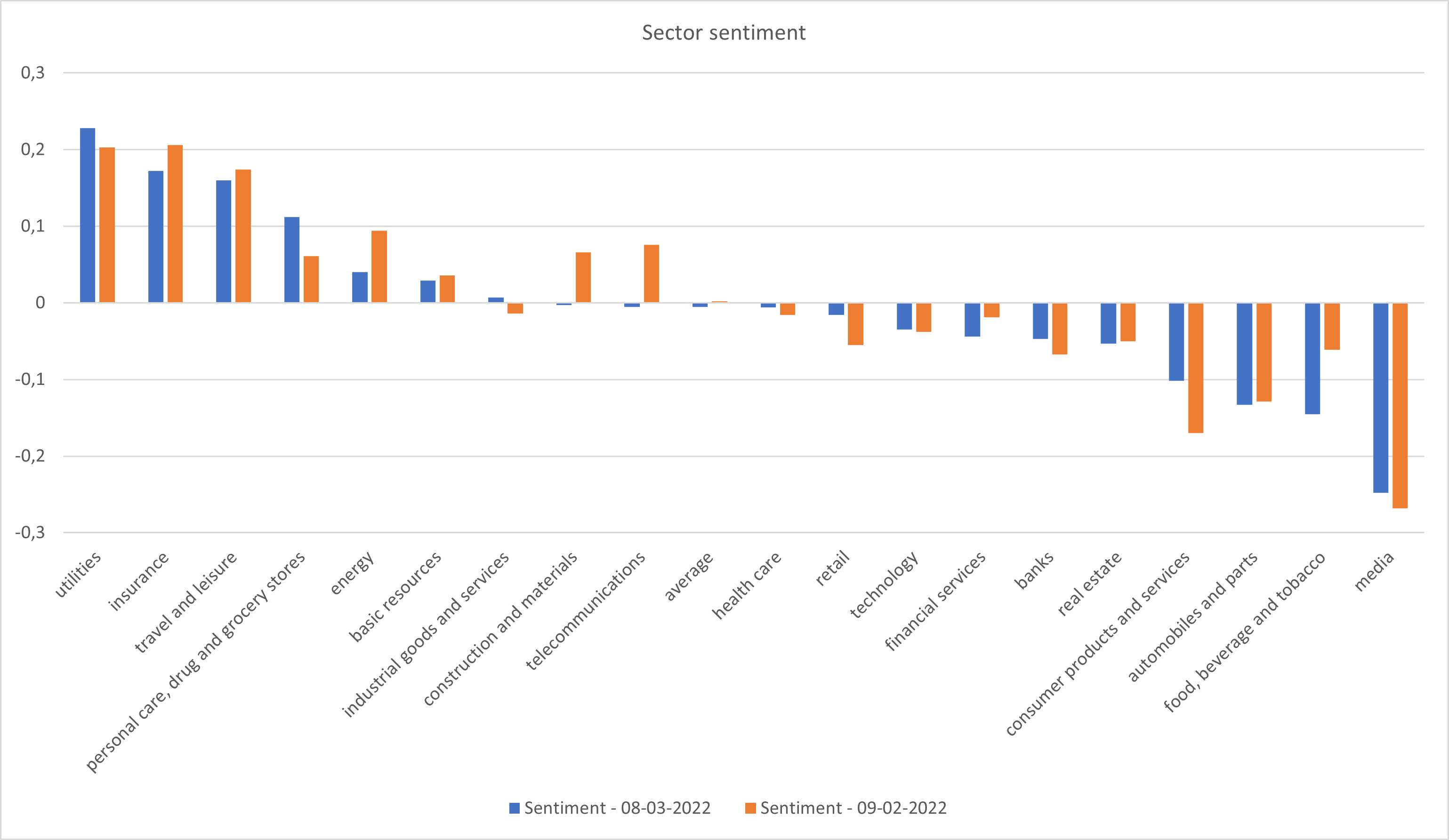 Even though the conflict in Ukraine is in its 15th day, some sectors have already been hits by negative corporate news. As our sector sentiment is focused on corporate news flow, the sentiment assessment only includes market participants opinions regarding this news flow.
